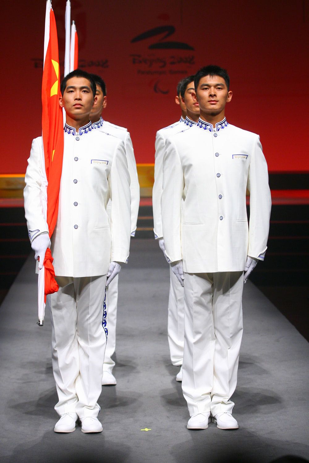 2008年北京奥运会开幕 柒牌中华立领“青花瓷”系列礼服被选定为北京奥运会和残奥会升旗手礼服