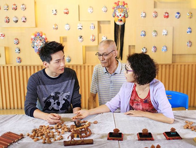 (陈楚生与阎良核雕传人赵秉科、赵慧萍)